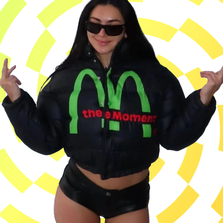 Of course, in true Charli XCX style, she didn't just show up at the Sundance premiere of her A24-produced mockumentary The Moment—she turned her outfit into a full-on cultural moment that I can't stop thinking about. She's been snapped in not one, but two custom puffer jackets made especially for the movie's promo: one a cropped black version with a Brat-green (naturally) "M" and the movie title, and another in bold red and cobalt hues—the kind of chaotic Charli energy we live for.