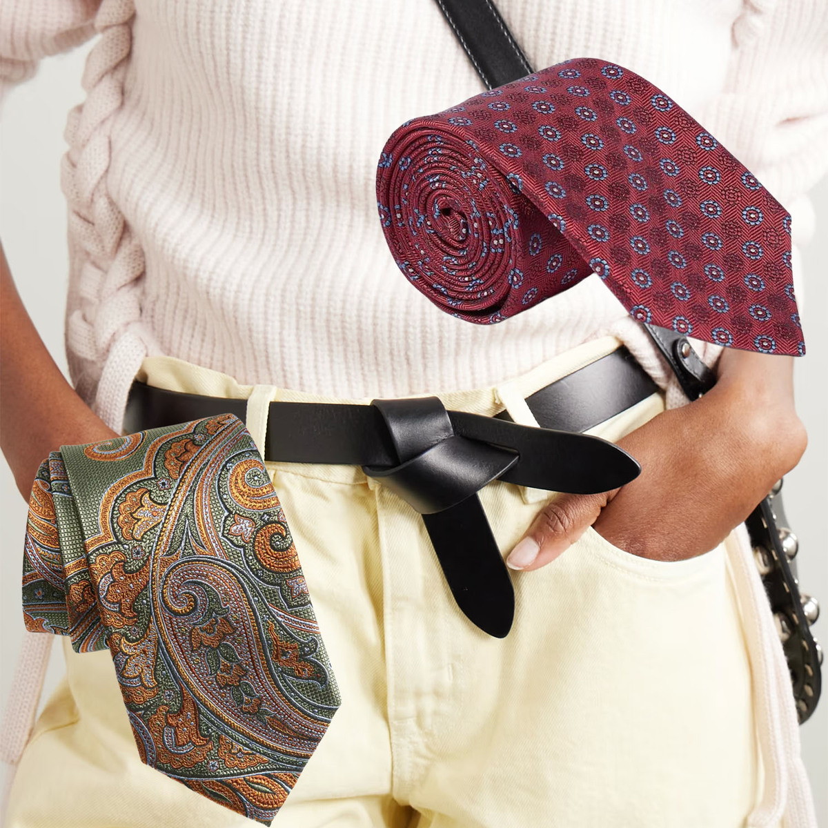Another belt replacement I’ve been using? Ties. I was in a belt bind at my boyfriend's place one time, and now his tie is a staple in my belt drawer. Adding a tie as a belt to your outfit makes it more playful and creative. It’s giving, “I have places to be after this.”