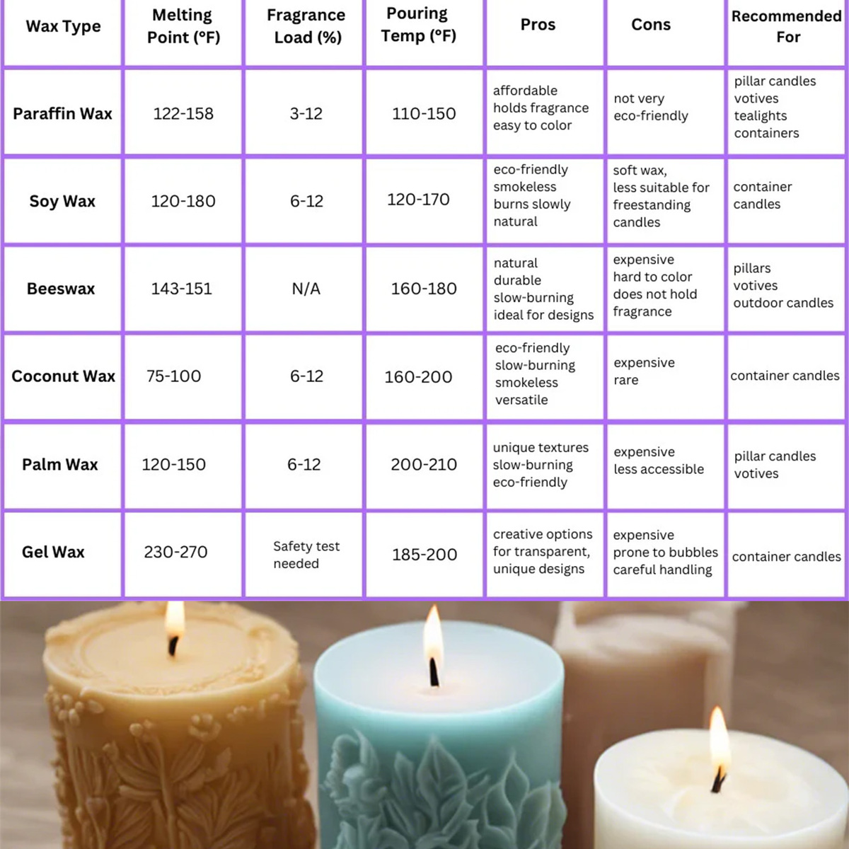 Paraffin wax holds sharp detail and suits pillar candles. It releases well from silicone molds but shrinks more than natural wax. As a result, it may need repours for flat tops.