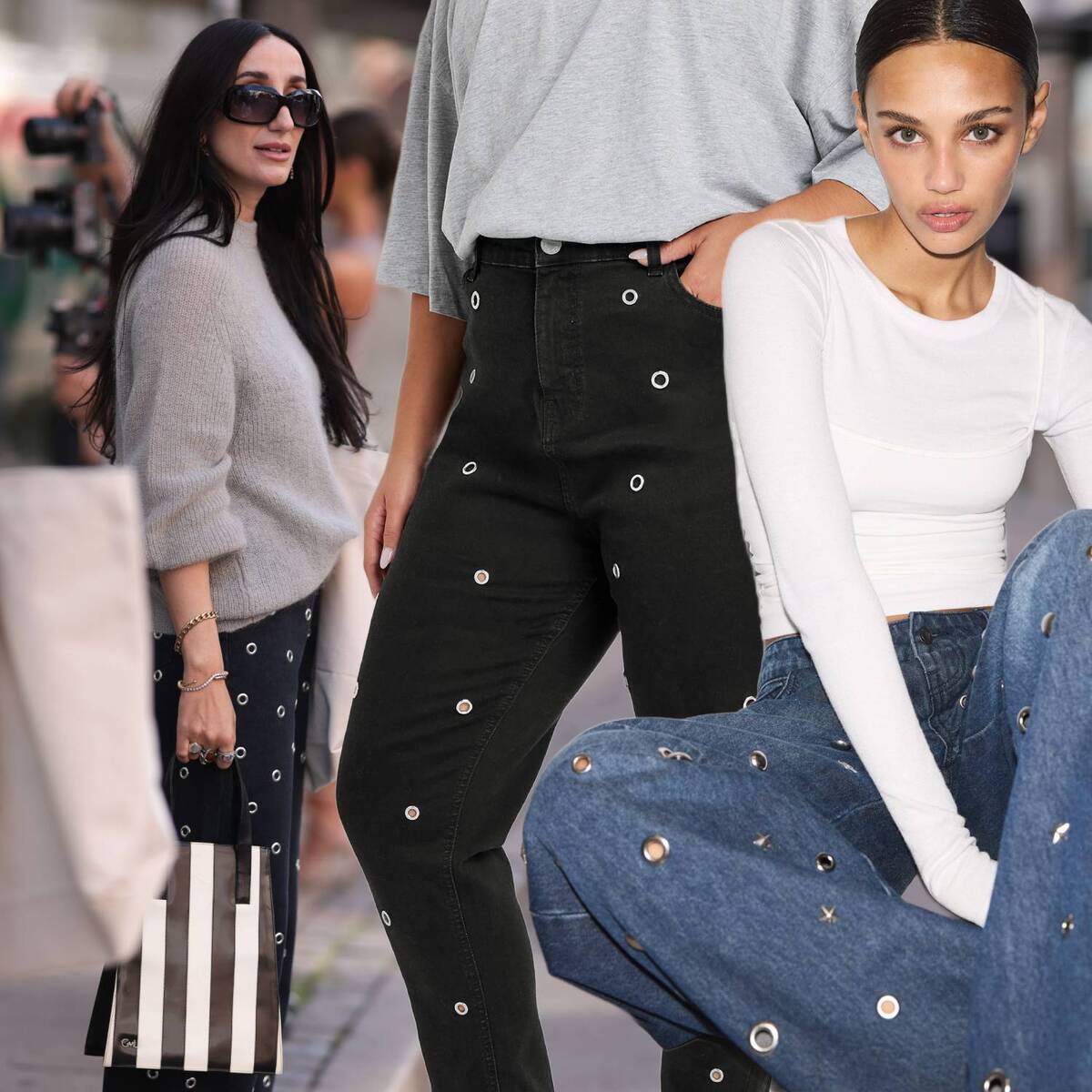 Now, we’ve unlocked party mode. The eyelet jeans have come to play, offering a visually appealing alternative to the more commonly seen rhinestone look. Joining our fringe jeans on the stage, the eyelet jeans come in a range of styles, from large holes that can be used to display tights underneath, to smaller more subtle looks. Available from a range of retailers and at differing price points, I must admit, I’m a fan. An eyelet jean feels like less of a commitment to glam than a rhinestone jean, but a little more put together than a fringe jean.