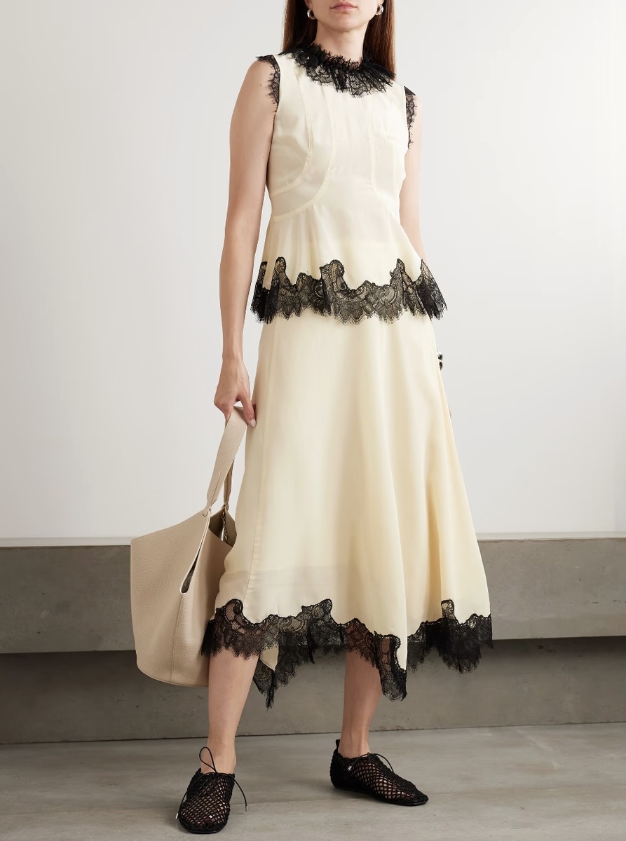 Rosine Asymmetric Contrast Lace-Trimmed Silk Midi-Skirt